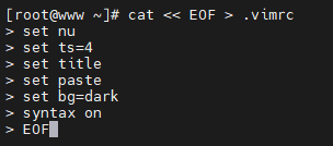 cat << EOF > .vimrc # 줄 번호 표시 set nu # tab 4 set ts=4 # 터미널 제목 표시 set title # 붙여넣기 모드로 설정 set paste # bg=dark 배경이 어두우면 글씨 밝아짐 set bg=dark # 문법 하이라이트 syntax on EOF