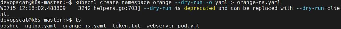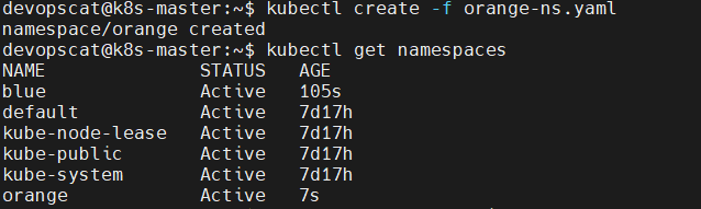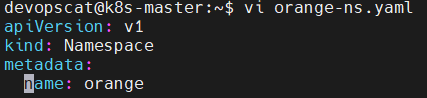 # namespace를 생성하기 위한 YAML 파일을 orange-ns.yaml 파일로 출력 kubectl create namespace orange --dry-run -o yaml > orange-ns.yaml # 파일 수정 vi orange-ns.yaml # yaml 파일로 생성 kubectl create -f orange-ns.yaml