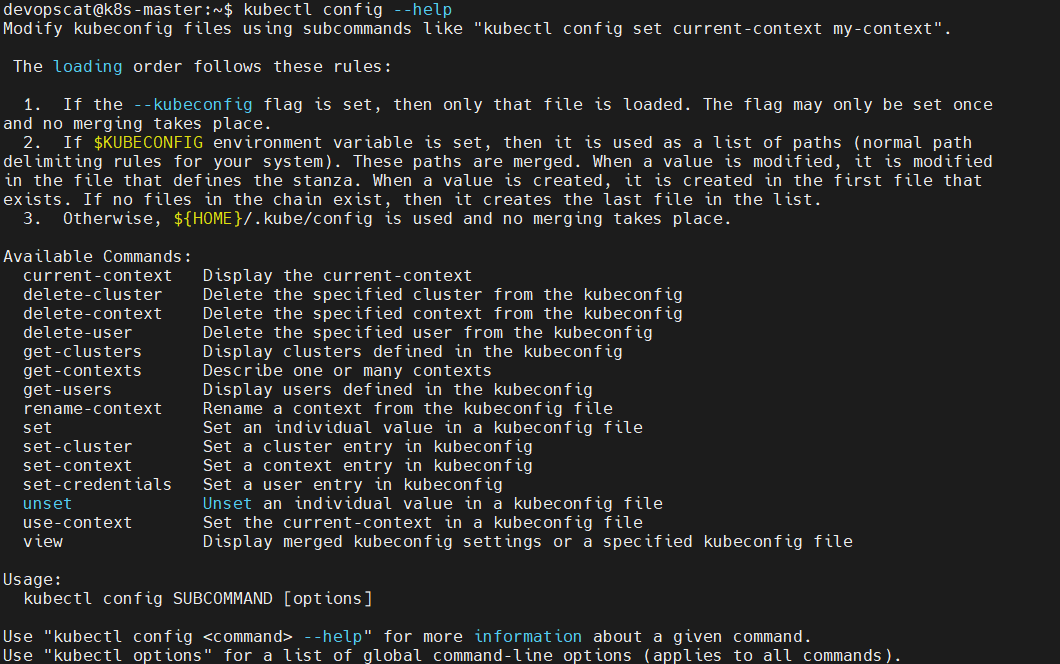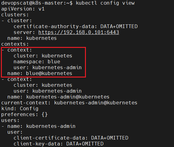 # namespace가 blue인 새로운 컨텍스트 생성 kubectl config set-context blue@kubernetes --cluster=kubernetes --user=kubernetes-admin --namespace=blue