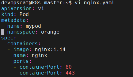 apiVersion: v1 kind: Pod metadata: name: mypod namespace: orange spec: containers: - image: nginx:1.14 name: nginx ports: - containerPort: 80 - containerPort: 443