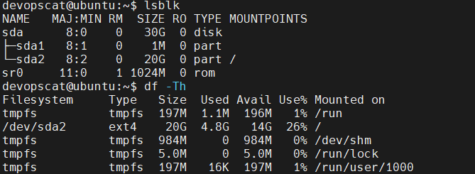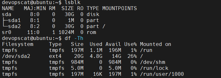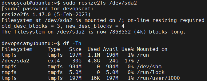 # ext4 파일시스템 크기 확장 sudo resize2fs /dev/sda2 # 파일시스템별 디스크 사용량과 남은 공간 확인 df -Th
