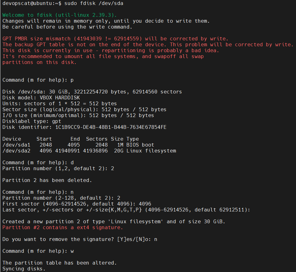 - ext4 signature 관련 질문 나오면 → n 입력 (y 누르면 ext4 파일시스템 정보 자체가 날아가서 데이터가 깨진다.)
