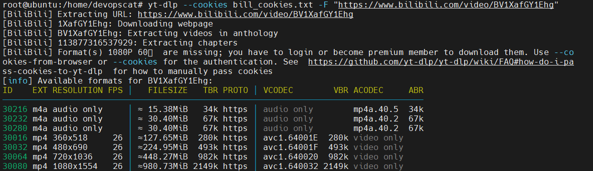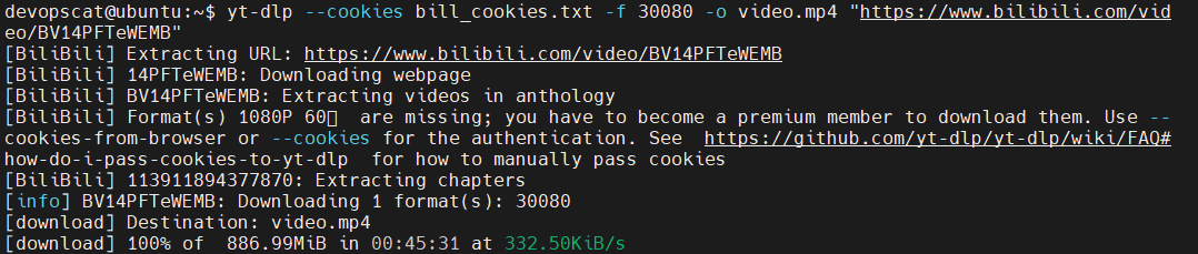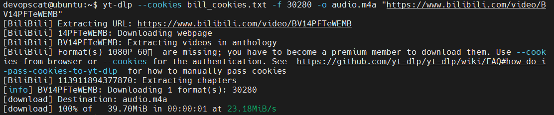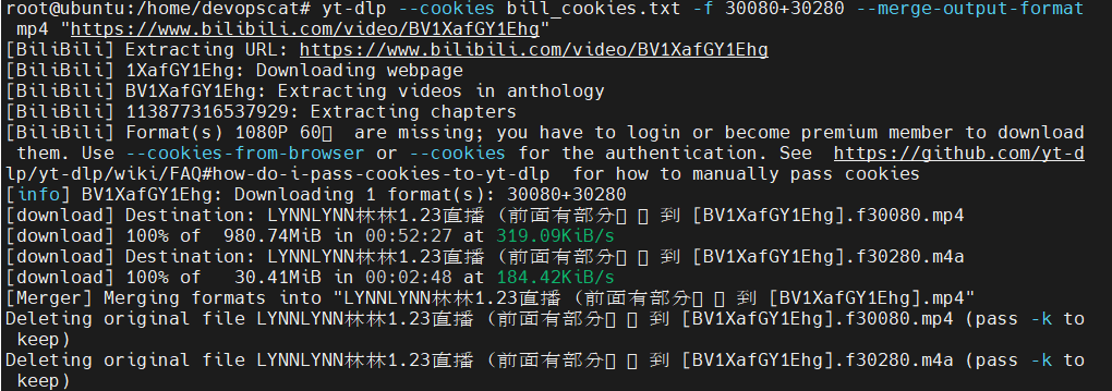 # 비디오 파일 다운로드 yt-dlp --cookies bill_cookies.txt -f 30080 -o video.mp4 "https://www.bilibili.com/video/" # 오디오 파일 다운로드 yt-dlp --cookies bill_cookies.txt -f 30280 -o audio.m4a "https://www.bilibili.com/video/" # 비디오 오디오 파일 병합 ffmpeg -i video.mp4 -i audio.m4a -c copy merged.mp4- 비디오 파일 다운로드