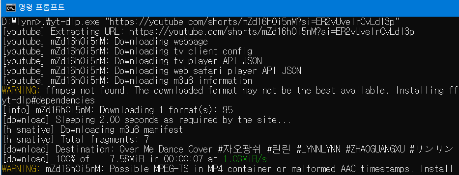 - cmd에서 영상 다운 받을 경로 이동 후 다운로드