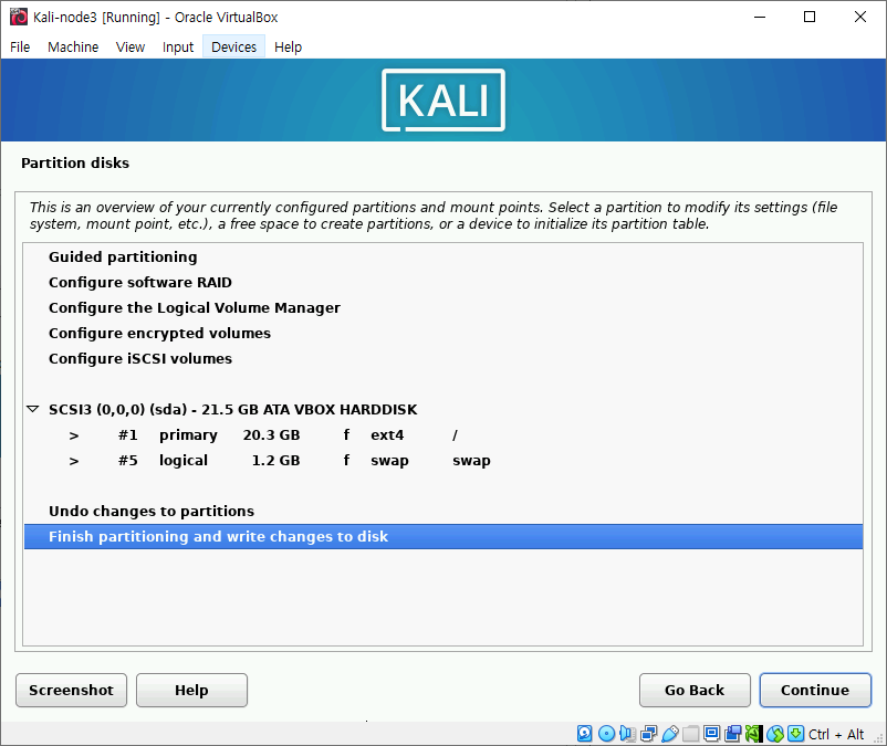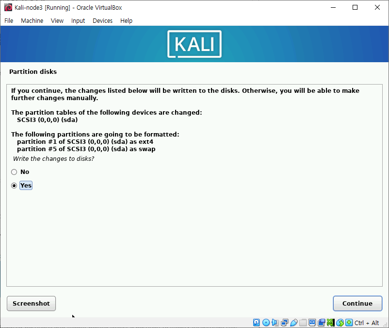 - If you continue, the changes listed below will be written to the disks.(변경 사항 디스크 쓰기) : yes 선택