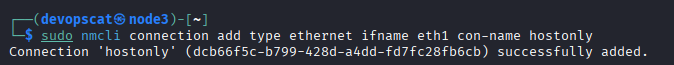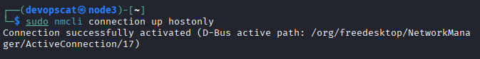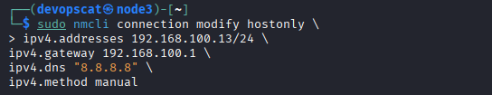 sudo nmcli connection modify hostonly \ ipv4.addresses 192.168.100.13/24 \ #ipv4.gateway 192.168.100.1 \ #ipv4.dns 8.8.8.8 \ ipv4.method manual
