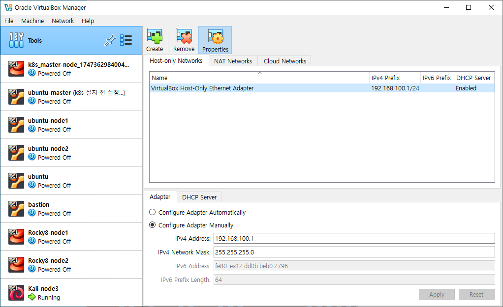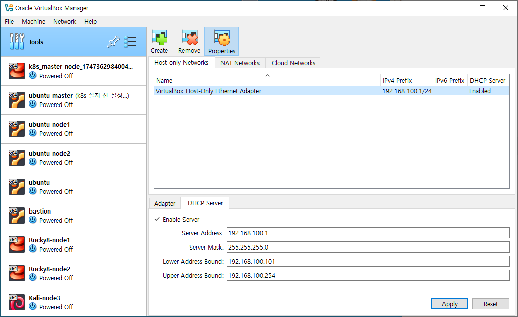 - 원인은 DHCP가 192.168.56.100 대역으로 설정되어 있어서 였다.