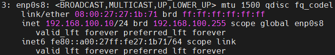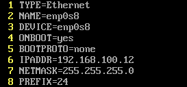 vi /etc/sysconfig/network-scripts/ifcfg-enp0s8TYPE=Ethernet NAME=enp0s8 DEVICE=enp0s8 ONBOOT=yes # DHCP 끔 BOOTPROTO=none # IP 수정 IPADDR=192.168.100.11 NETMASK=255.255.255.0 PREFIX=24