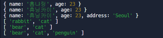 // 객체 속성값 변경 및 추가 // 객체 정의 const obj1 = { name: "흠냐링", age: 23, }; console.log(obj1); // 속성 값 변경 obj1.name = "휴닝카이"; console.log(obj1); // 속성 추가 obj1.address = "Seoul"; console.log(obj1); // 배열값 변경, 추가 // 배열 정의 const arr1 = ["rabbit", "cat"]; console.log(arr1); // 첫번째 값 변경 arr1[0] = "bear"; console.log(arr1); // 값 추가 arr1.push("penguin") console.log(arr1);