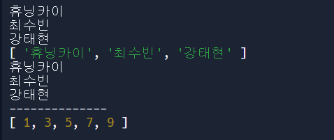 // 기존 for문 const nameArr = ["휴닝카이", "최수빈", "강태현"] // for문을 이용한 배열 처리 for(let index = 0; index < nameArr.length; index++) { console.log(nameArr[index]); } // map() 에서는 배열을 순서대로 처리한 결과를 배열로 밭을 수 있다. // 배열.map() const nameArr1 = ["휴닝카이", "최수빈", "강태현"] // 화살표 함수는 배열의 각 요소를 인수로 받아 처리할 수 있으며, 이 인수는 콜백 함수 내에서 사용할 수 있다. // 배열의 각 요소는 map 메서드의 콜백 함수로 전달되어 처리되며, 콜백 함수는 처리된 값을 반환한다. const nameArr2 = nameArr1.map((name) => { return name }); console.log(nameArr2); // for문을 map() 사용 const nameArr3 = nameArr2.map((name) => console.log(name)); console.log('--------------'); // filter 함수는 return 뒤의 조건식을 입력해서 일치는 것만 반환한다. // 홀수 추출하기 const numArr = [1, 2, 3, 4, 5, 6, 7, 8, 9, 10]; const newArr = numArr.filter((num) => { return num % 2 === 1; }); console.log(newArr); // [1, 3, 5, 7, 9]