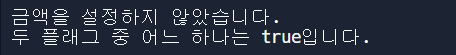 // || (OR) // 논리 연산자 ||이 연산자의 왼쪽이 false라고 판정하면 오른쪽을 반환 // 반대로 왼쪽이 true이면 왼쪽을 반환한다. // 자바스크립트에서 false 판정 (null, undefined, 0) const num = null; const fee = num || "금액을 설정하지 않았습니다."; console.log(fee); // 금액을 설정하지 않았습니다. // 논리 연산자를 이용한 조건 분기 const flag1 = true; const flag2 = false; // const flag1 = false; // const flag2 = true; // 왼쪽이 false이면 오른쪽은 반환(왼쪽이 true이면 왼쪽 반환) // 결과적으로 '또는(OR)' 같은 동작을 하게 된다. if(flag1 || flag2) { console.log("두 플래그 중 어느 하나는 true입니다."); }
