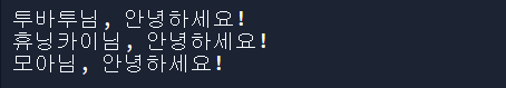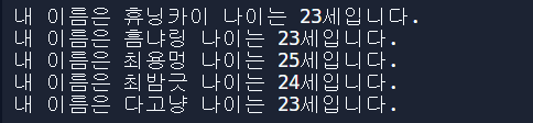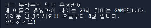 // 문자열 안에서 자바스크립트 값을 다룰 때는 템플릿 문자열을 이용 하는 것이 좋다. const team = "투바투" const name = "휴닝카이"; const age = 23; const hobby = "GAME"; const idol = "나는 " + team + "의 막내 " + name; const message = `내 이름은 ${name} 나이는 ${age}세 취미는 ${hobby}입니다.`; console.log(idol); console.log(message); function sayHello() { return "안녕하세요!"; } const month = 2; const message2 = `여러분 ${sayHello()}! 오늘부터 ${month * 4}월 입니다.`; console.log(message2); console.log(sayHello());