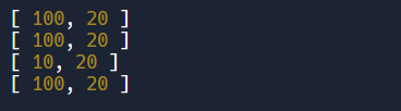 // 복사할 때 예상치 못한 작동 const arr4 =[10, 20]; // = 로 복사 const arr8 = arr4; // arr8의 처음 요소를 100으로 덮어 씀 arr8[0] = 100; // 복사 후 배열에 대한 조작이 복사 전 배열에도 영향을 준다. console.log(arr4); // [100, 20] console.log(arr8); // [100, 20] // 스프레드 구문을 이용한 복사 const arr5 = [10, 20]; const arr7 = [...arr5]; // arr7의 처음 요소를 100으로 덮어 씀 arr7[0] = 100; console.log(arr5); // [10, 20] console.log(arr7); // [100, 20]