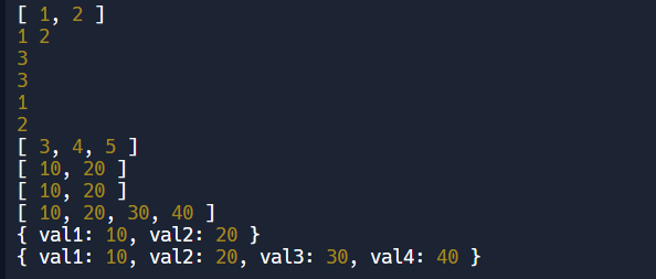 /* 스프레드 구문 */ // 일반적인 함수와 스프레드 구문 비교 const arr1 = [1, 2]; // 요소 전개 console.log(arr1); // [1, 2] console.log(...arr1); // 1 2 const summaryFunc = (num1, num2) => console.log(num1 + num2); // 일반적으로 배열 값을 전달하는 경우 summaryFunc(arr1[0], arr1[1]); // 3 // 스프레드 구분을 이용하는 방법 summaryFunc(...arr1); // 3 // 요소 모으기 const arr2 = [1, 2, 3, 4, 5]; const [num1, num2, ...arr3] = arr2; console.log(num1); // 1 console.log(num2); // 2 console.log(arr3); // [3, 4, 5] // 스프레드 구문을 이용해 새로운 배열 생성 const arr4 = [10, 20]; const arr5 = [30, 40]; // 스프레드 구문을 이용해 복사 const arr6 = [...arr4]; console.log(arr4); console.log(arr6); // 두개의 배열 결합 const arr7 = [...arr4, ...arr5]; console.log(arr7); // 여러 객체 결합 const obj4 = {val1: 10, val2: 20}; const obj5 = {val3: 30, val4: 40}; // 스프레드 구문을 이용해 복사 const obj6 = {...obj4}; // 스프레드 구문을 이용해 결합 const obj7 = {...obj4, ...obj5}; console.log(obj6); console.log(obj7);