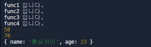 // 화살표 함수() => {} // 기존 함수 1 // 기존 함수 정의 function func1(value) { return value; } console.log(func1("func1 입니다.")); // 함수를 정의하고 변수에 저장 // 기존 함수 2 const func2 = function (value) { return value; }; console.log(func1("func2 입니다.")); // 화살표 함수 const func3 = (value) => { return value; }; console.log(func3("func3 입니다.")); // 화살표 함수 생략 표기법 // 화살표 함수 정의(인수가 한개이므로 소괄호 생략) const func4 = value => { return value; }; console.log(func4("func4 입니다.")); // 인수가 두 개인 경우 // 인수가 두개 이상이면 소괄호로 감싼다. const func5 = (value1, value2) => { return value1 + value2 }; console.log(func5(20,30)); // return 생략 // 처리를 한 행으로 반환하는 경우 {}, return 생략 가능 const func6 = (num1, num2) => num1 + num2; console.log(func6(30,40)); // 반환 값이 여러 행일 경우 ()로 감싼 뒤 단일 행과 같이 모아서 반환 // ()를 이용해 한 행으로 모으기 const func7 = (val1, val2) => ( { name: val1, age: val2, } ) console.log(func7("휴닝카이", 23));