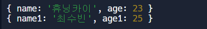 // 객체 생략 표기법 // 객체 속성명과 설정할 변수명이 같으면 생략할 수 있다. // 속성과 변수명이 같은 경우 ① const name = "휴닝카이"; const age = 23; // user 객체 정의(속성은 name, age) const user = { name: name, age: age, }; console.log(user); // 속성과 변수명이 같은 경우 ② // 객체 설정에서 :(콜론) 이후를 생략하고 하나로 모을 수 있다. // 객체 분할 대입에서 alias를 붙이는 방법의 반대 형태이다. const name1 = "최수빈"; const age1 = 25; const user1 = { name1, age1, }; console.log(user1);
