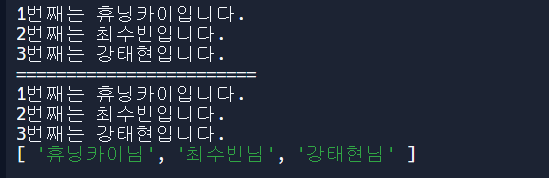 // for문을 index를 이용해 요소를 순서대로 출력 const nameArr = ["휴닝카이", "최수빈", "강태현"] for(let index = 0; index < nameArr.length; index++) { console.log(`${index + 1}번째는 ${nameArr[index]}입니다.`); } // map()의 인수를 이용해 요소 순서대로 추출 // 두번째에 인수의 index를 넣는다. console.log("========================") nameArr.map((name, index) => console.log(`${index + 1}번째는 ${name}입니다.`)); // 님을 붙인 새로운 배열 생성 const newArr = nameArr.map((name) => { if(name === "휴닝카이") { return `${name}님`; } else { return `${name}님`; } }); console.log(newArr);