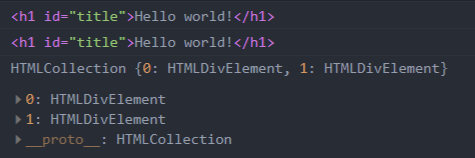 // selector로 요소 얻기 // getElementById 사용 const title1 = document.getElementById("title"); console.log(title1); // querySelector 사용 const title2 = document.querySelector("#title"); console.log(title2); // 클래스명으로 엘리먼트 얻기 const containers = document.getElementsByClassName("container"); console.log(containers);