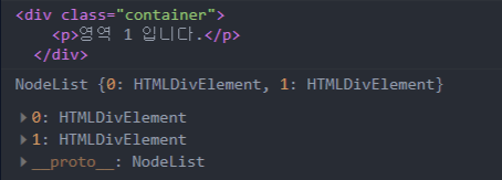 // querySelector는 가장 처음 일치한 요소를 반환하므로 한 개의 엘리먼트를 얻는다. const container = document.querySelector(".container"); console.log(container); // querySelectorAll은 여러 엘리먼트를 얻는다. 일치하는 엘리먼트를 모두 얻는다. const containers2 = document.querySelectorAll(".container"); console.log(containers2);