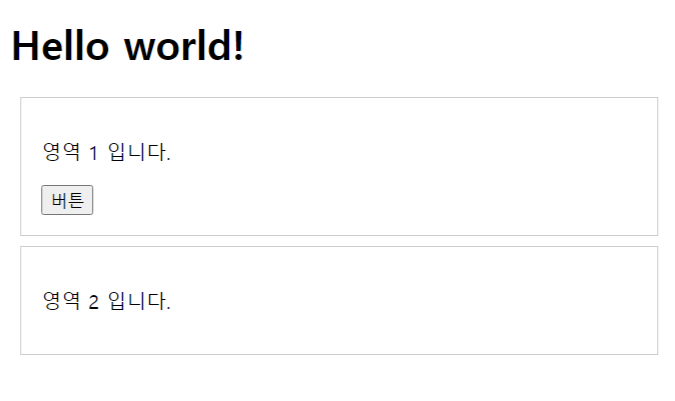 <!DOCTYPE html> <html> <head> <meta charset="utf-8"> <meta name="viewport" content="width=device-width"> <title>JavaScript에서 DOM 조작</title> <link href="style.css" rel="stylesheet" type="text/css" /> </head> <body> <h1 id="title">Hello world!</h1> <div class="container"> <p>영역 1 입니다.</p> </div> <div class="container"> <p>영역 2 입니다.</p> </div> <script src="script.js"></script> </body> </html>- style.css