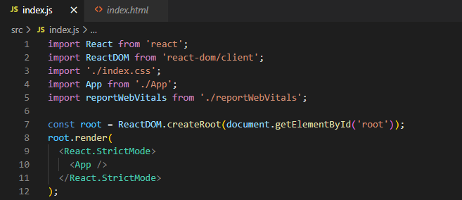 - React 애플리케이션의 진입점(entry point)은 index.js 파일이다. 여기서는 React DOM 라이브러리를 사용하여 index.html의 root라는 DOM 요소에 React 컴포넌트를 렌더링(render)한다.