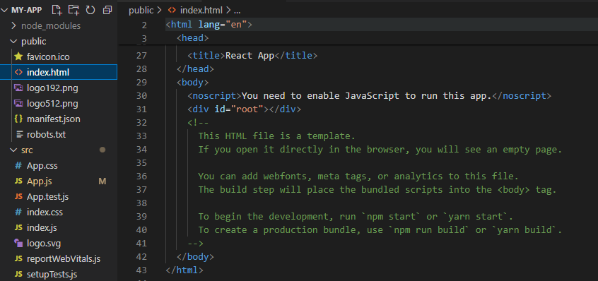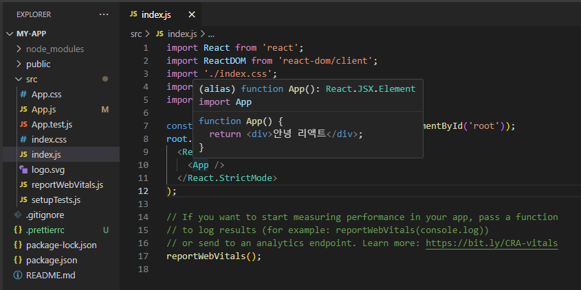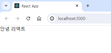 import './App.css'; function App() { return <div>안녕 리액트</div>; } export default App;- npm start 시 index.html 파일을 index.js를 통해 id가 root인 요소에 렌더링 한다.