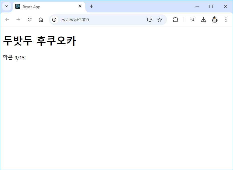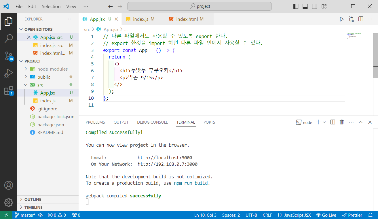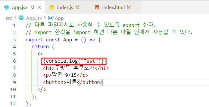 // 다른 파일에서도 사용할 수 있도록 export 한다. // export 한것을 import 하면 다른 파일 안에서 사용할 수 있다. export const App = () => { return ( <> <h1>두밧두 후쿠오카</h1> <p>막콘 9/15</p> </> ); };- src/index.js