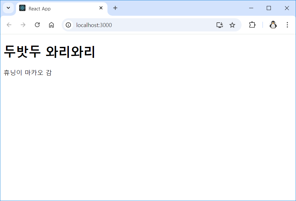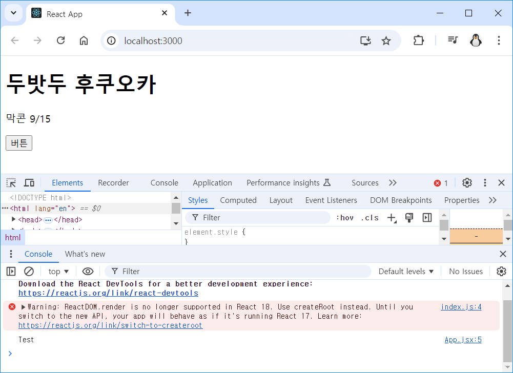 // react-dom 라이브러리에서 ReactDOM이라는 이름으로 모듈을 import 한다. import ReactDOM from "react-dom"; // 함수 정의 const App = () => { // return 이후 행이 여러 행일 경우 ()로 감싼다. // return 이후 한개의 태그로 둘러싸여 있어야한다. div로 감싼다. return ( <div> <h1>두밧두 와리와리</h1> <p>휴닝이 마카오 감</p> </div> ); }; // 첫번째 인수 render 대상, 두번 째 인수 render 위치 // 리액트에서는 함수명을 HTML과 같이 태그로 감싸서 컴포넌트로 다룰 수 있다. ReactDOM.render(<App />, document.getElementById("root"));
