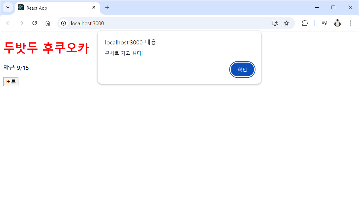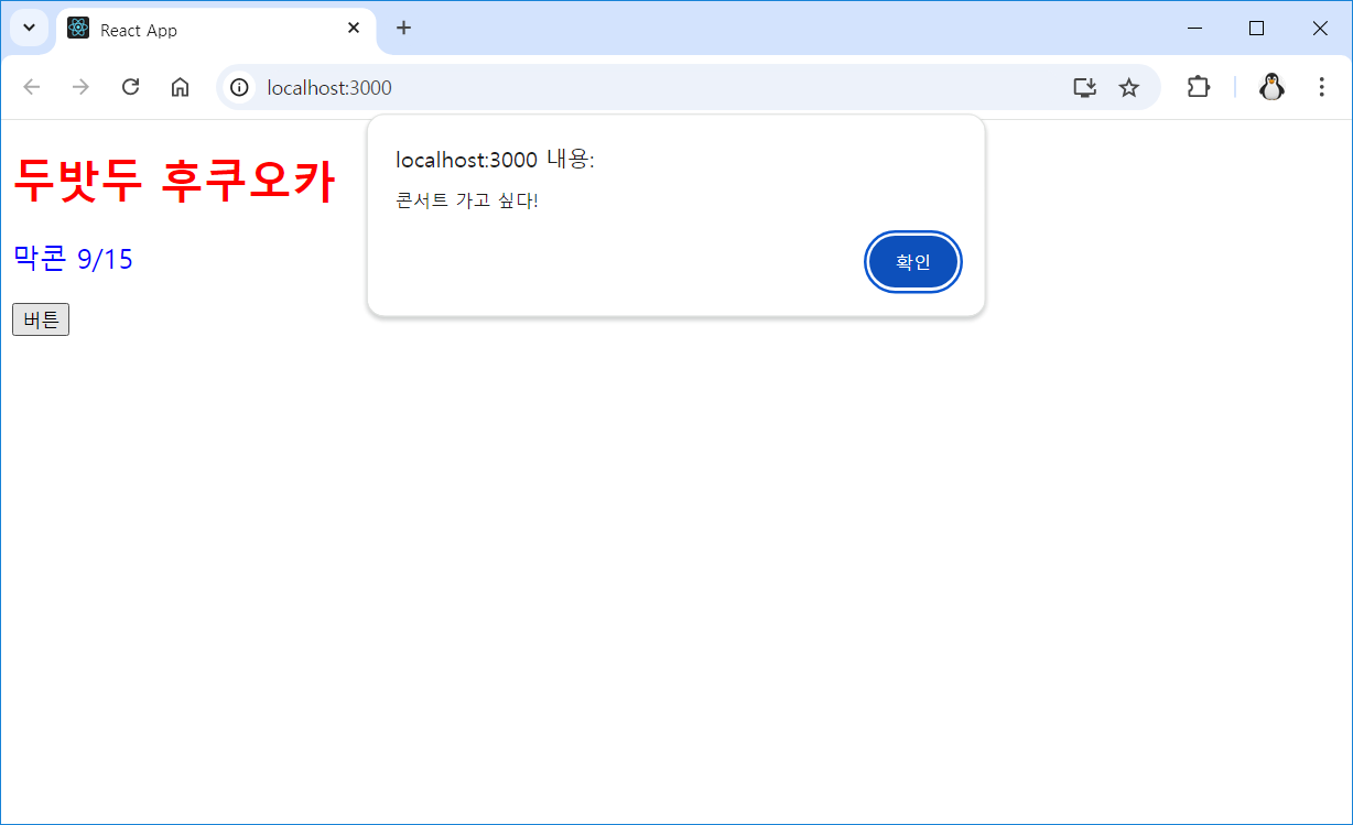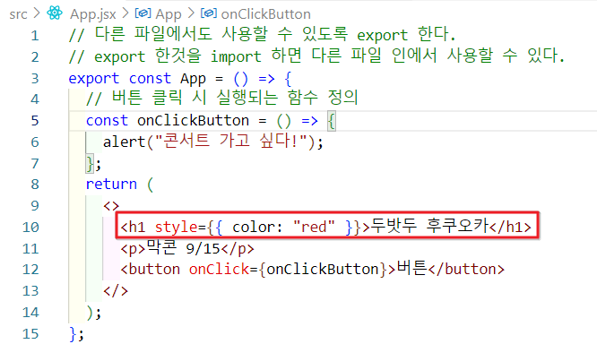 // 다른 파일에서도 사용할 수 있도록 export 한다. // export 한것을 import 하면 다른 파일 인에서 사용할 수 있다. export const App = () => { // 버튼 클릭 시 실행되는 함수 정의 const onClickButton = () => { alert("콘서트 가고 싶다!"); }; return ( <> <h1>두밧두 후쿠오카</h1> <p>막콘 9/15</p> <button onClick={onClickButton}>버튼</button> </> ); };