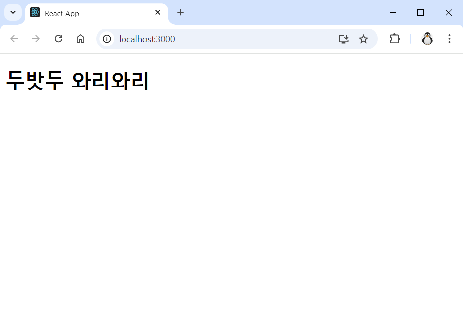 // react-dom 라이브러리에서 ReactDOM이라는 이름으로 모듈을 import 한다. import ReactDOM from "react-dom"; // 함수 정의 const App = () => { // return null; return <h1>두밧두 와리와리</h1>; }; // 첫번째 인수 render 대상, 두번 째 인수 render 위치 // 리액트에서는 함수명을 HTML과 같이 태그로 감싸서 컴포넌트로 다룰 수 있다. ReactDOM.render(<App />, document.getElementById("root"));