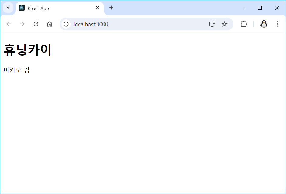 import ReactDOM from "react-dom"; import { Fragment } from "react"; const App = () => { return ( <Fragment> <h1>휴닝카이</h1> <p>마카오 감</p> </Fragment> ); }; ReactDOM.render(<App />, document.getElementById("root"));2) 생략표기법(빈 태그) 사용