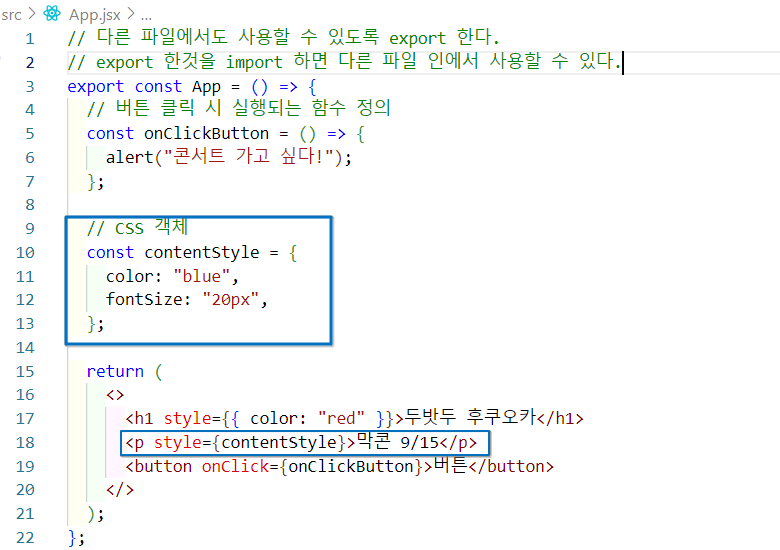 // 다른 파일에서도 사용할 수 있도록 export 한다. // export 한것을 import 하면 다른 파일 안에서 사용할 수 있다. export const App = () => { // 버튼 클릭 시 실행되는 함수 정의 const onClickButton = () => { alert("콘서트 가고 싶다!"); }; // CSS 객체 const contentStyle = { color: "blue", fontSize: "20px", }; return ( <> <h1 style={{ color: "red" }}>두밧두 후쿠오카</h1> <p style={contentStyle}>막콘 9/15</p> <button onClick={onClickButton}>버튼</button> </> ); };'JS&React' 카테고리의 다른 글